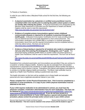 MARYLAND SCHOOLS RECORD OF PHYSICAL EXAMINATION To Parents or Guardians: In order for your child to enter a Maryland public school for the first time, the following are required: ... Fetch This Document